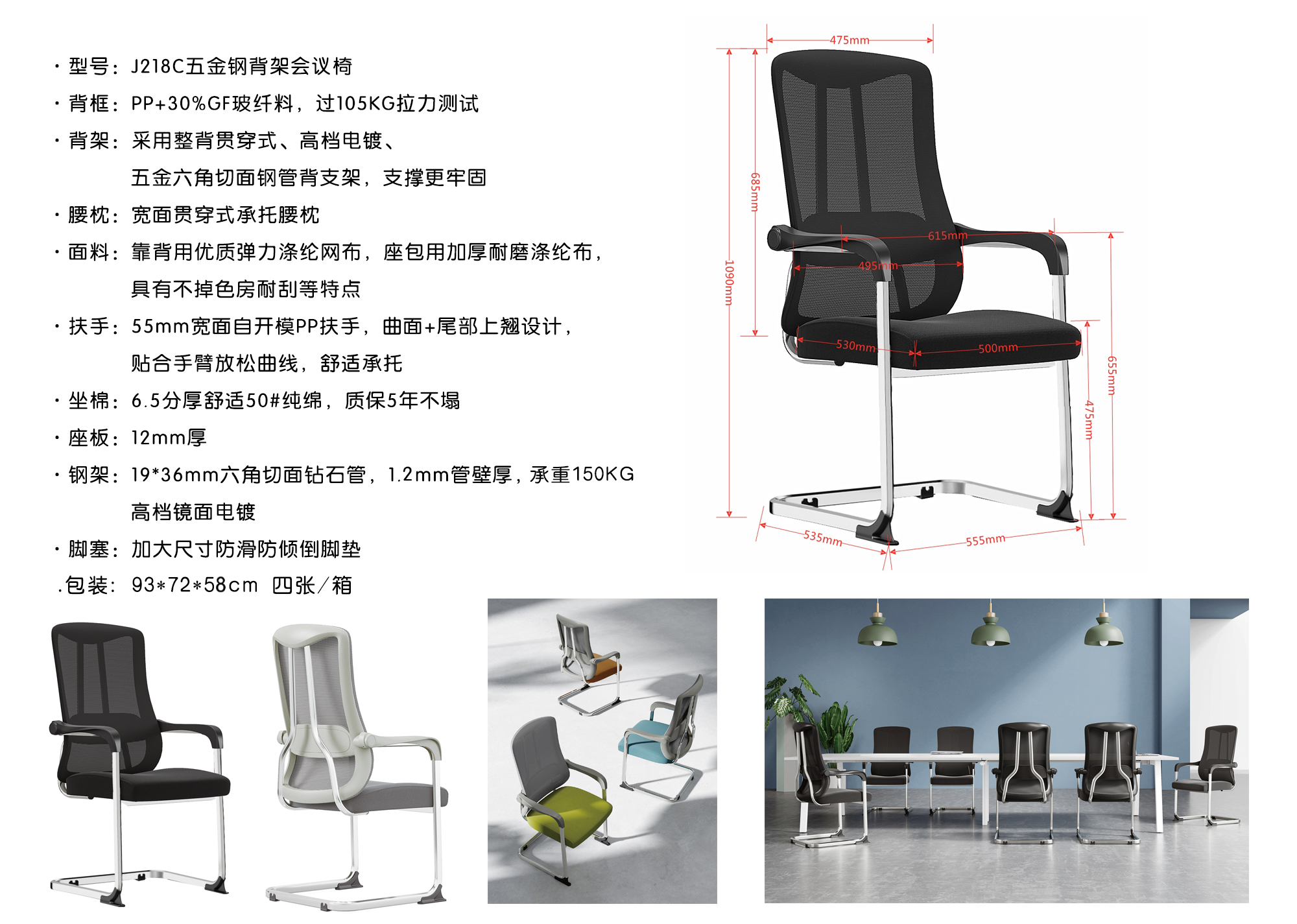 ·背框:PP+30%GF玻纤料,过105KG拉力测试 ·背架:采用整背贯穿式、高档电镀、五金六角切面钢管背支架,支撑更牢固 ·腰枕:PP支架+高弹海绵包网柔软舒适腰枕面 ·面料:靠背用优质弹力涤纶网布,座包用加厚耐磨涤纶布,具有不掉色房耐刮等特点 ·扶手:55mm宽面自开模PP扶手,曲面+尾部上翘设计,贴合手臂放松曲线,舒适承托 ·坐垫棉:6.5分厚舒适50#纯绵,质保5年不塌 ·座板:12mm厚 ·钢架:19*36mm六角切面钻石管,1.8mm管壁厚,高档镜面电镀 ·脚塞:加大尺寸防滑防倾倒脚垫